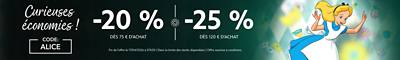 -20 % dès 75 €+ d'achats | -25 % dès 120 €+ d'achats | Code: ALICE