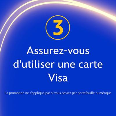 3. La remise de 20% est réservée aux détenteurs de carte Visa et sera appliquée au moment du paiement une fois le code promo (VISA20) saisi et les informations bancaires correspondantes à la carte Visa vérifiées. La promotion ne s'applique pas si vous passez par portefeuille numérique